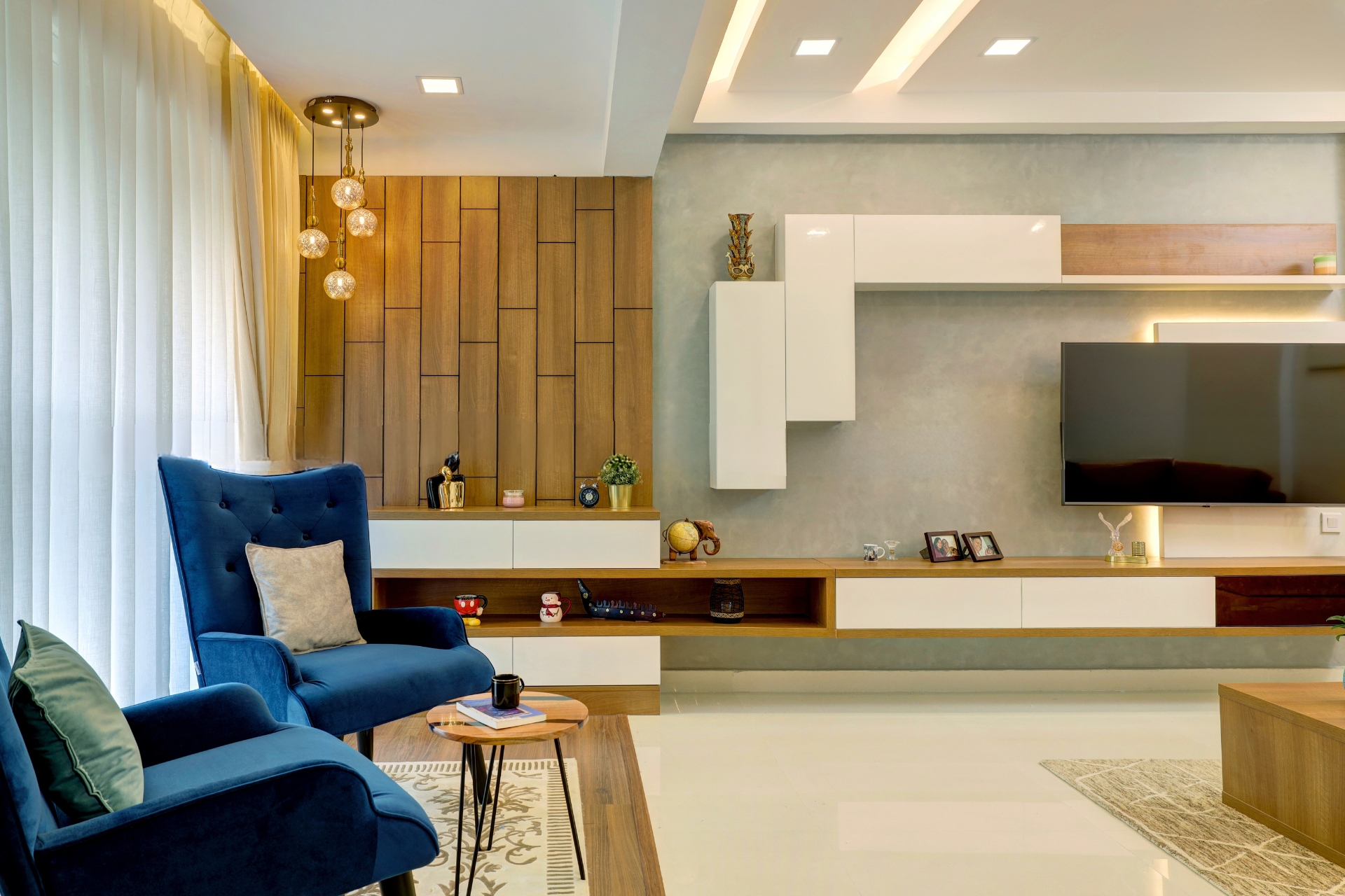 This contemporary apartment exudes understated elegance with its crisp white tile floors and a sophisticated blend of white and grey walls. The neutral backdrop creates a serene atmosphere, allowing the rich wooden accents throughout the space to stand out. Warm light fixtures cast a soft glow, enhancing the natural textures of the wood and adding depth to the rooms. The minimalist design is complemented by clean lines and thoughtfully chosen furnishings, making the apartment feel both open and inviting. The combination of cool tones and warm lighting creates a balanced, cozy ambiance, making this home a perfect retreat with a modern yet timeless appeal.